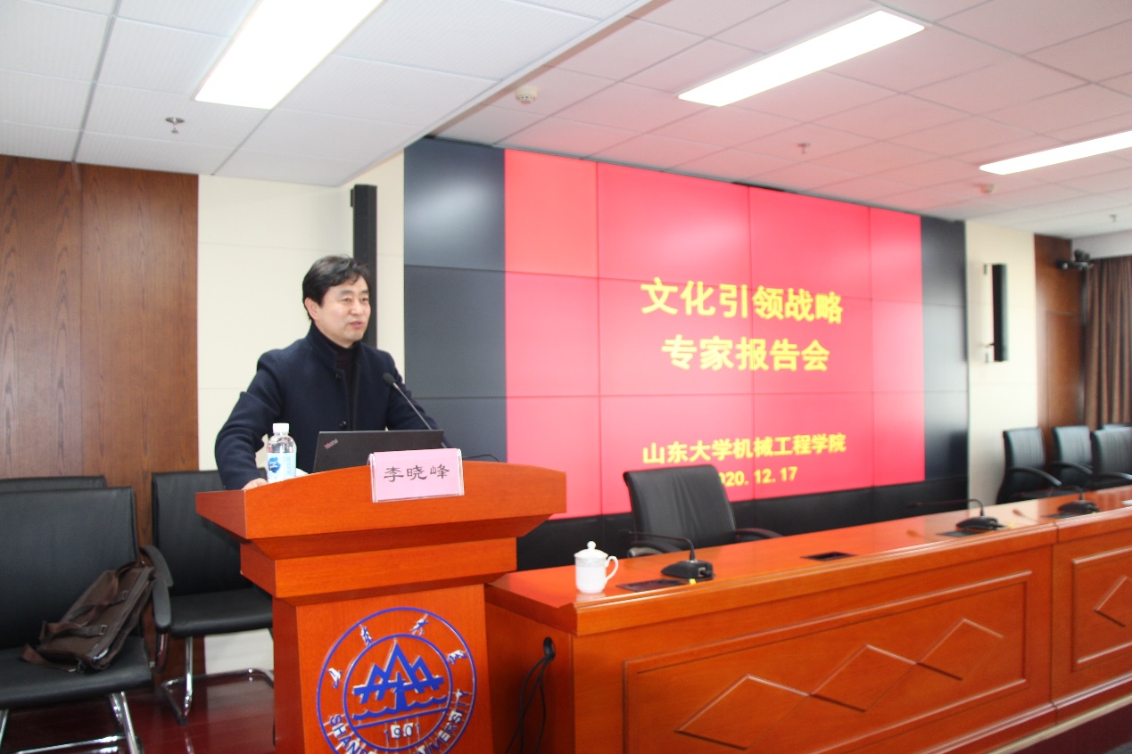12月17日下午,mg冰球突破官方网站在创新大厦1103举办了文化引领战略专题报告会,报告会邀请艺术学院党委书记、威海校区艺术学院院长李晓峰教授作了题为“百廿学府与文化引领战略”的报告。mg冰球突破官方网站院长黄传真、党委书记刘杰及领导班子成员、机关全体人员、教师党支部书记、35岁以下青年教师、师生代表参加了报告会。报告会由学院党委书记刘杰主持。